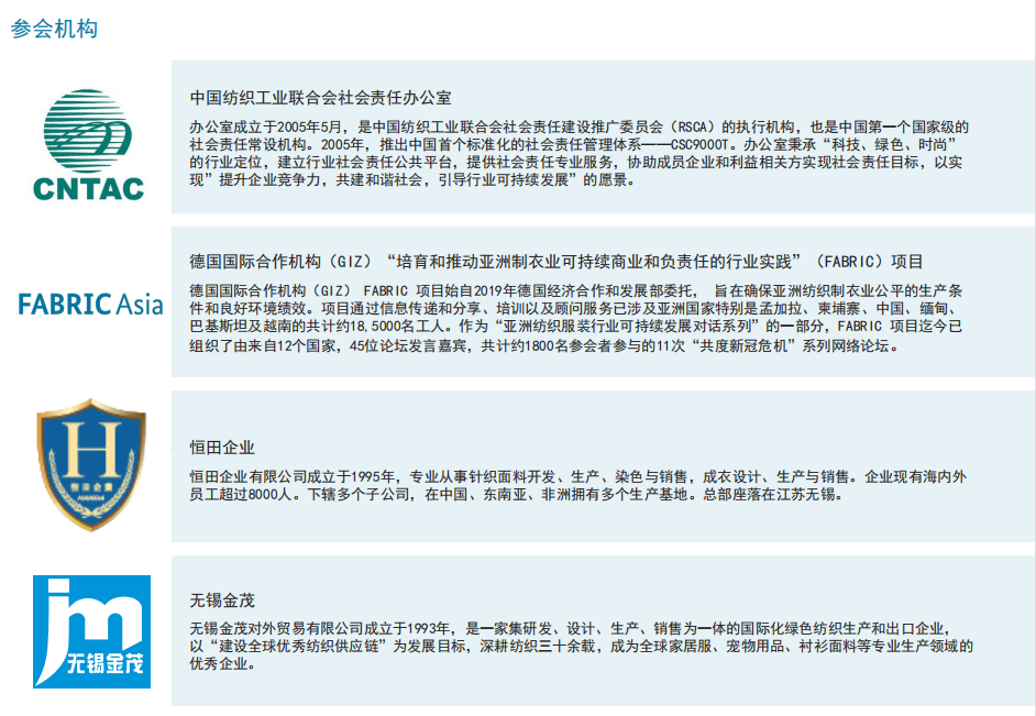 為了深入了解和探討這些問題,在德國國際合作機構(gòu)(GIZ)的協(xié)助下,中國紡織工業(yè)聯(lián)合會(CNTAC)社會責(zé)任辦公室開展了涉及在緬甸、柬埔寨、越南和孟加拉的85家中資企業(yè)的調(diào)查研究,并將在本次會議發(fā)布調(diào)研報告。