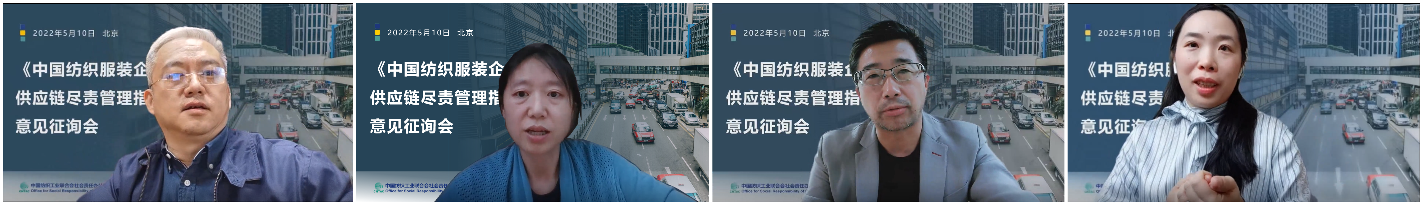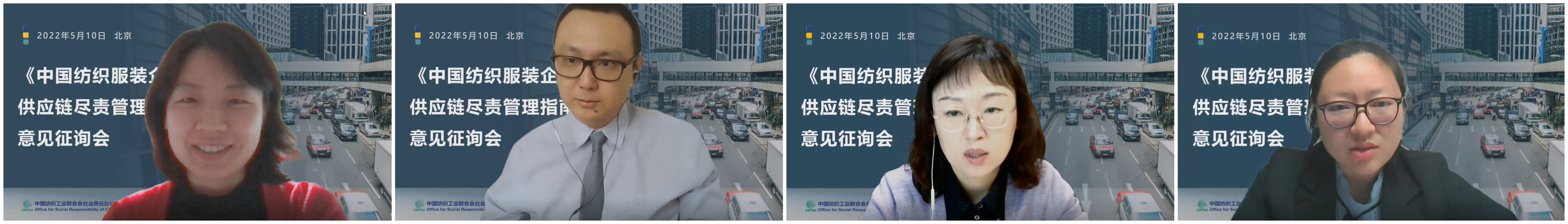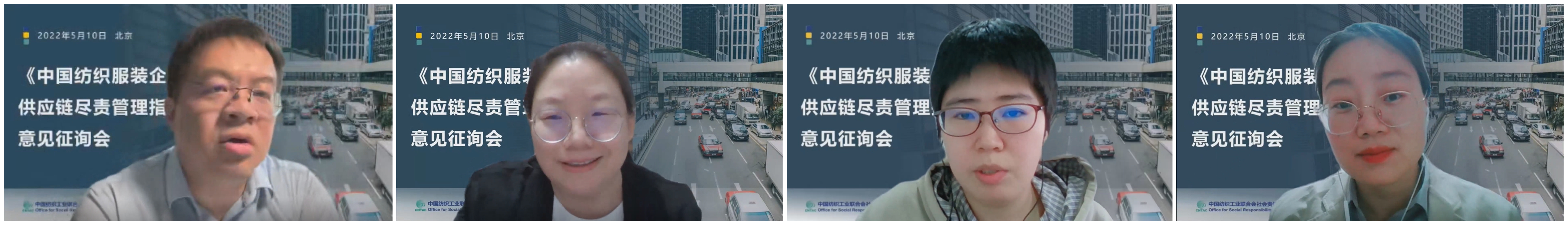2022年5月10日下午,由中國紡織工業(yè)聯(lián)合會(huì)社會(huì)責(zé)任辦公室主辦的《中國紡織服裝企業(yè)社會(huì)與環(huán)境盡責(zé)管理指南(征求意見稿)》(暫定名,下稱“《盡責(zé)管理指南》”或“指南”)意見征詢會(huì)在線上成功舉辦。來自南開大學(xué)、北京工商大學(xué)、聯(lián)合國開發(fā)計(jì)劃署(UNDP)、聯(lián)合國兒童基金會(huì)(UNICEF)、經(jīng)濟(jì)合作與發(fā)展組織(OECD)、德國國際合作機(jī)構(gòu)(GIZ)等十五家機(jī)構(gòu)的二十余位專家參加了本次會(huì)議,就盡責(zé)管理指南的改進(jìn)與實(shí)施進(jìn)行了全面、深入的討論。