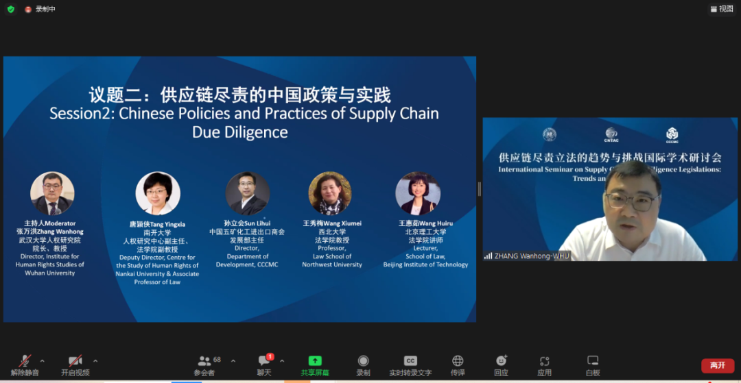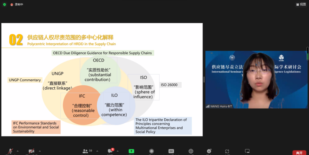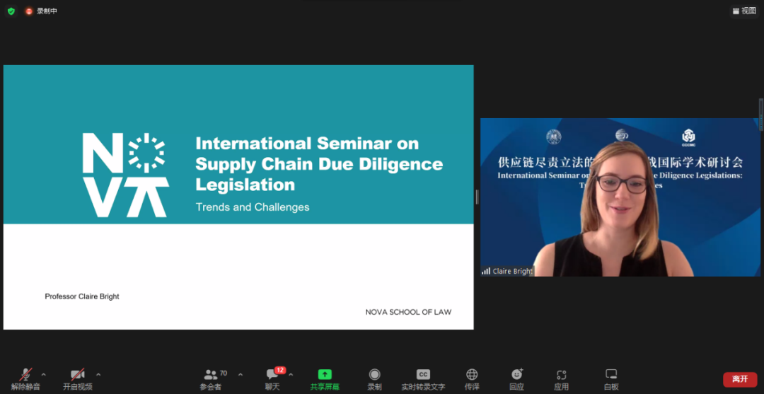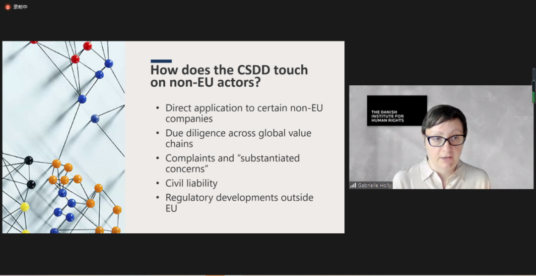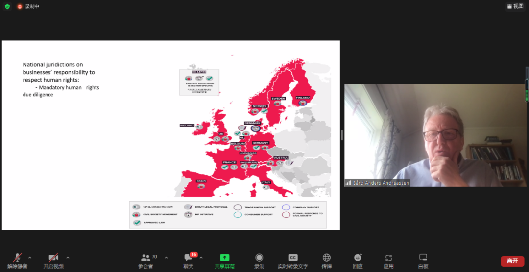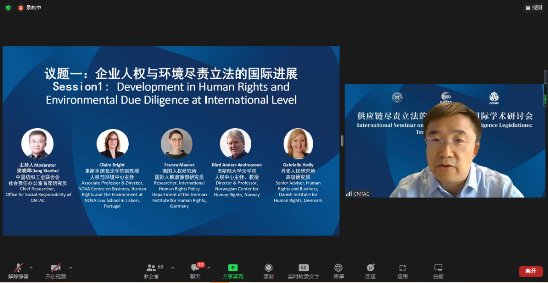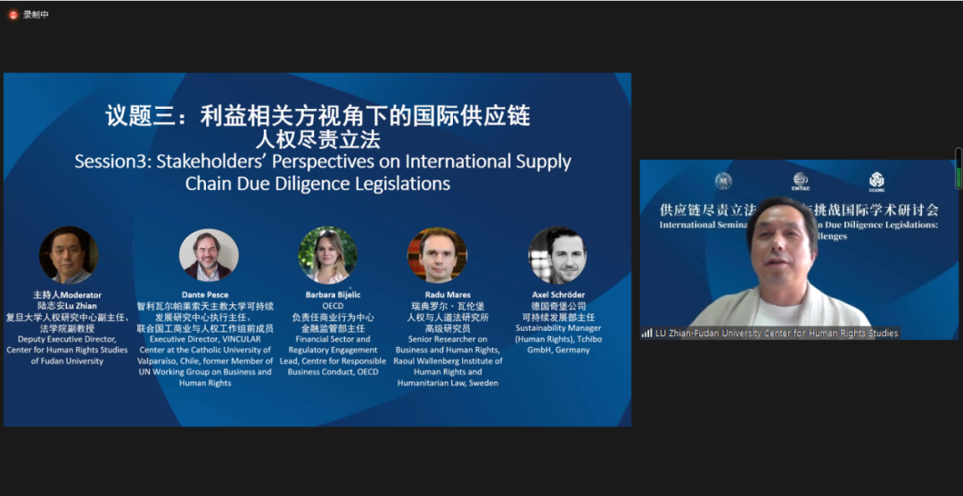 由復旦大學人權(quán)研究中心副主任陸志安副教授擔任主持人。智利瓦爾帕萊索天主教大學社會責任與可持續(xù)發(fā)展研究中心執(zhí)行主任、聯(lián)合國工商業(yè)與人權(quán)工作組前成員Dante Pesce教授討論了強制性人權(quán)盡責立法的實施對發(fā)展中和新興經(jīng)濟體的影響,經(jīng)合組織(OECD)負責任商業(yè)行為中心金融監(jiān)管部主任Barbara Bijelic 梳理了經(jīng)合組織與強制性人權(quán)盡責立法的發(fā)展的關系,瑞典羅爾·瓦倫堡人權(quán)與人道法研究所高級研究員Radu Mares分析了歐盟企業(yè)可持續(xù)盡責指令對公司法以及企業(yè)管理職責的影響,德國奇堡公司可持續(xù)發(fā)展部主任 Axel Schröder分享了奇堡公司在應對供應鏈人權(quán)盡責立法方面的策略和經(jīng)驗,及其對中國合作伙伴的建議和期望。