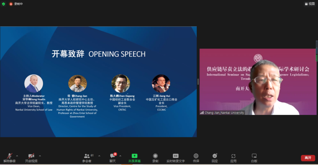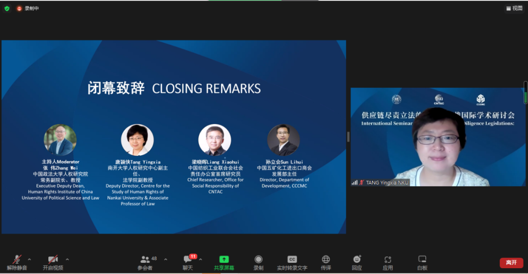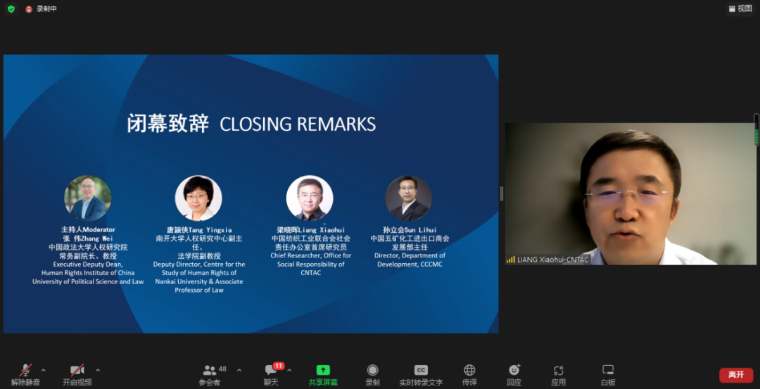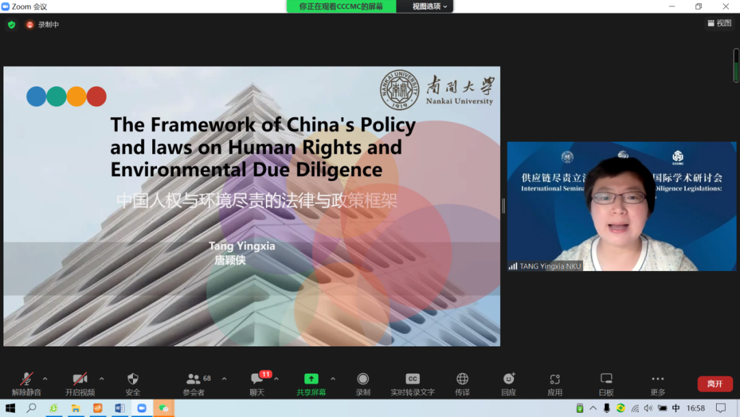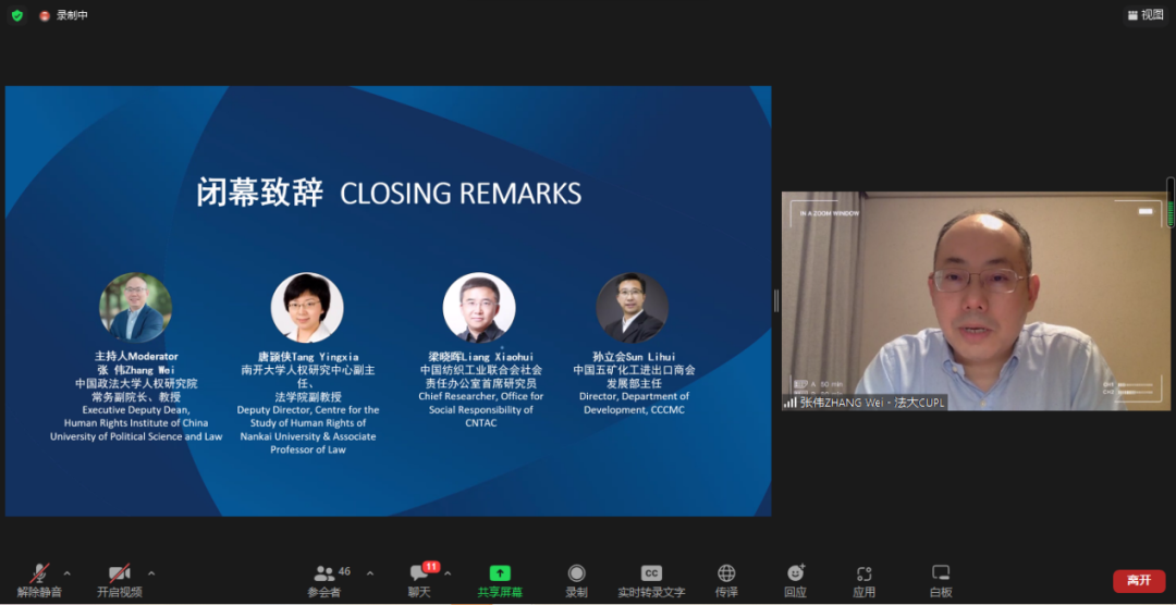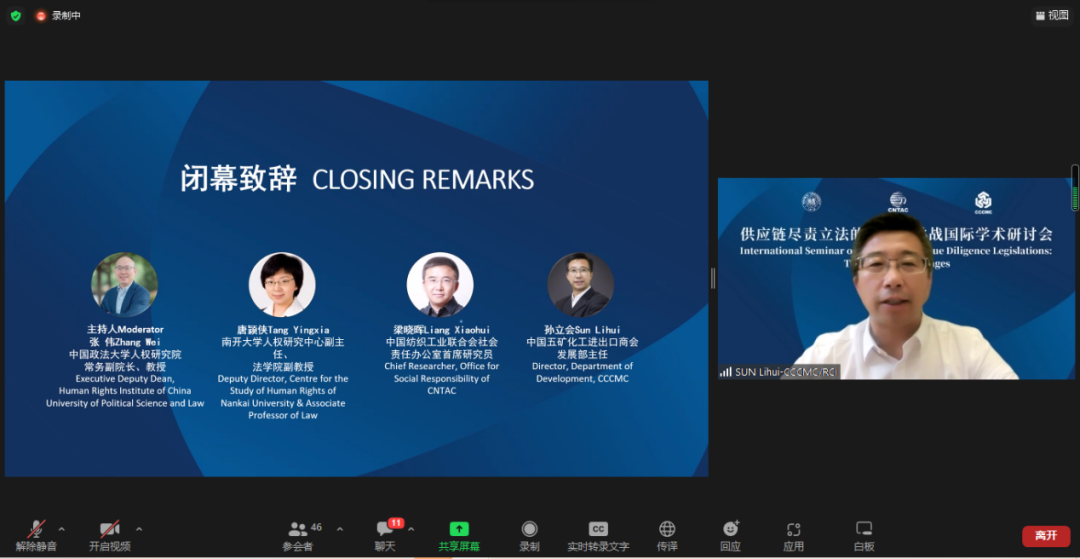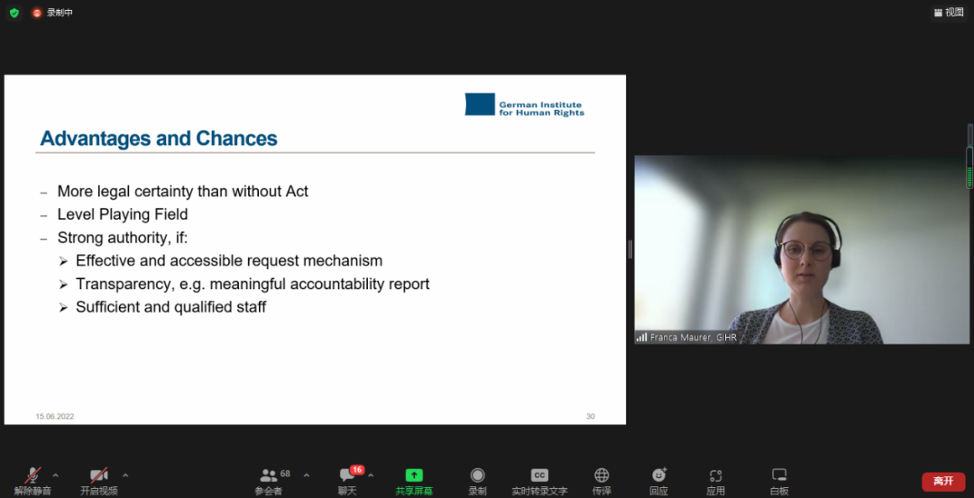 由復旦大學人權(quán)研究中心副主任陸志安副教授擔任主持人。智利瓦爾帕萊索天主教大學社會責任與可持續(xù)發(fā)展研究中心執(zhí)行主任、聯(lián)合國工商業(yè)與人權(quán)工作組前成員Dante Pesce教授討論了強制性人權(quán)盡責立法的實施對發(fā)展中和新興經(jīng)濟體的影響,經(jīng)合組織(OECD)負責任商業(yè)行為中心金融監(jiān)管部主任Barbara Bijelic 梳理了經(jīng)合組織與強制性人權(quán)盡責立法的發(fā)展的關系,瑞典羅爾·瓦倫堡人權(quán)與人道法研究所高級研究員Radu Mares分析了歐盟企業(yè)可持續(xù)盡責指令對公司法以及企業(yè)管理職責的影響,德國奇堡公司可持續(xù)發(fā)展部主任 Axel Schröder分享了奇堡公司在應對供應鏈人權(quán)盡責立法方面的策略和經(jīng)驗,及其對中國合作伙伴的建議和期望。
