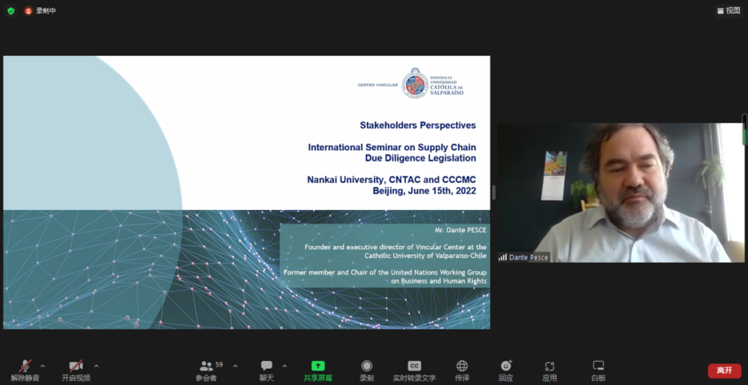 智利瓦爾帕萊索天主教大學社會責任與可持續(xù)發(fā)展研究中心執(zhí)行主任、聯(lián)合國工商業(yè)與人權(quán)工作組前成員Dante Pesce教授發(fā)言