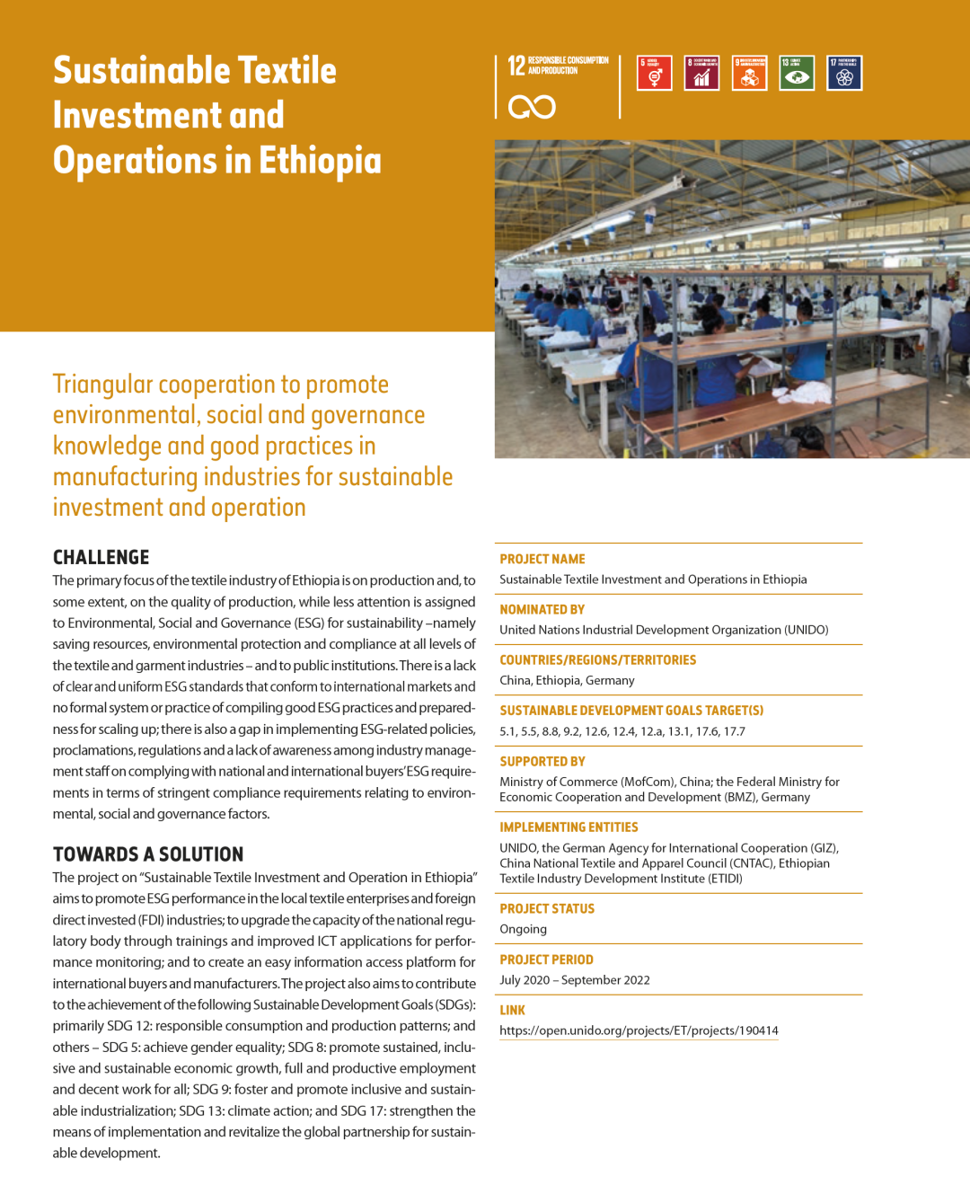 埃塞項目是在中國、德國和埃塞俄比亞三國關于“埃塞俄比亞可持續紡織業投資與運營”三方合作框架下,由中國紡織工業聯合會(CNTAC)、聯合國工業發展組織(UNIDO)、德國國際合作機構(GIZ)和埃塞俄比亞制造業發展研究院(EMIDI)合作執行,旨在提高埃塞俄比亞紡織服裝企業的環境、社會和治理(ESG)績效,并提升行業的可持續發展能力。具體分為基線調研、能力建設和經驗推廣三大階段。