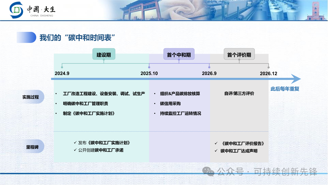 根據(jù)《T/CNTAC 187—2023〈紡織行業(yè)碳中和工廠創(chuàng)建和評(píng)價(jià)技術(shù)規(guī)范〉》,大生集團(tuán)制定了詳細(xì)的碳中和實(shí)施計(jì)劃:將全面盤查工廠溫室氣體排放,推進(jìn)節(jié)能技改、分布式光伏建設(shè)、儲(chǔ)能電站投用及綠電采購等項(xiàng)目,對(duì)無法通過技術(shù)手段消除的剩余排放實(shí)施碳抵消,最終實(shí)現(xiàn)工廠運(yùn)營范圍內(nèi)的碳中和。