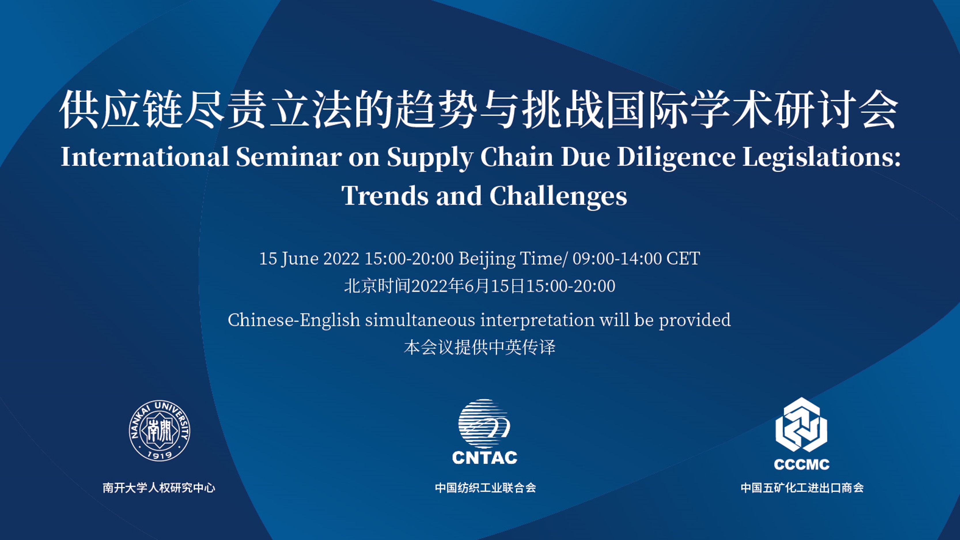 2022年6月15日,由南開大學人權研究中心主辦,中國紡織工業聯合會和中國五礦化工進出口商會合辦的“供應鏈盡責立法的趨勢與挑戰國際學術研討會”通過在線平臺順利舉行,超過一千八百人次實時觀看了此次研討會。